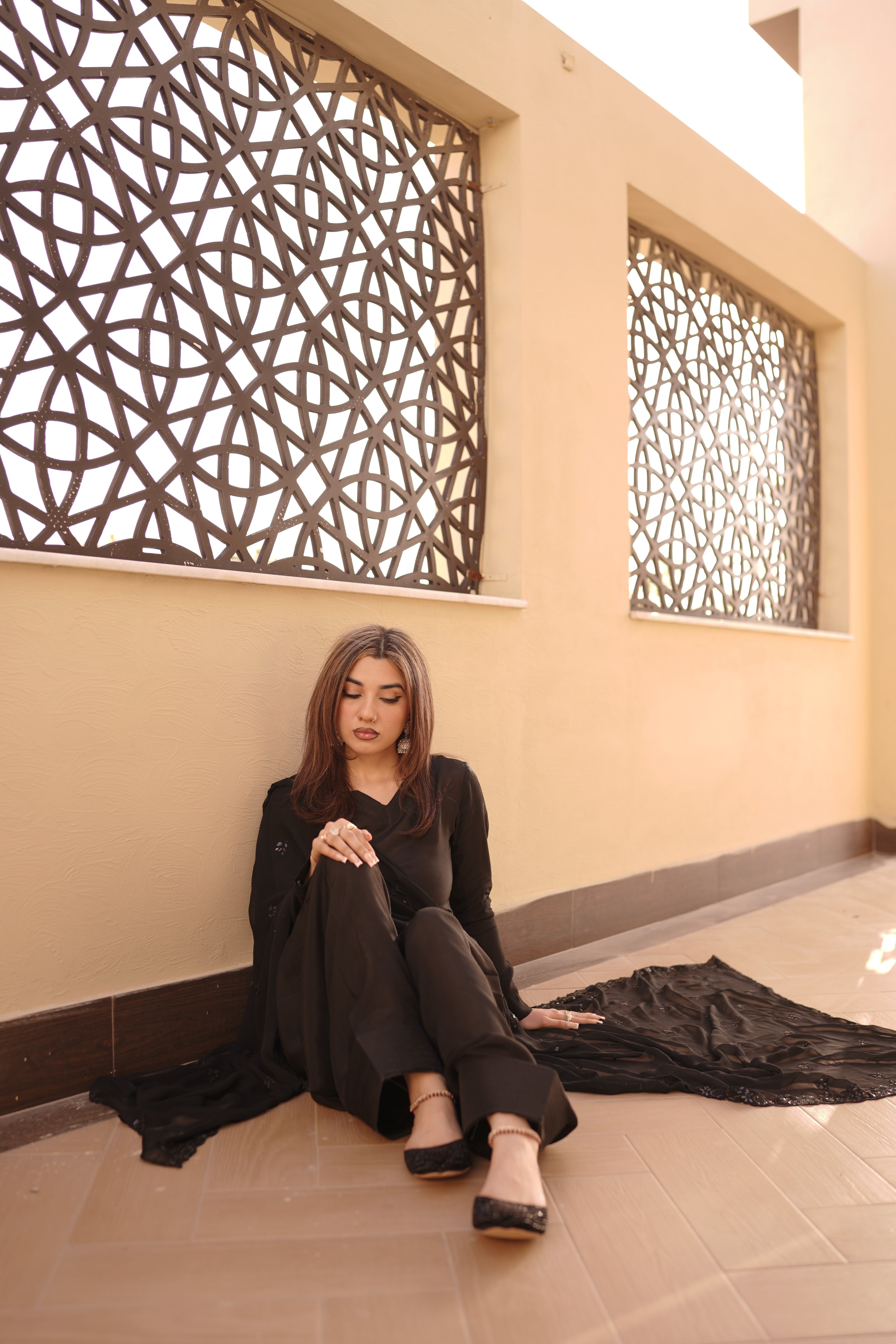 Elevate your style with this exquisite 3-piece farshi shalwar suit, featuring a beautifully tailored kameez paired with a flowing, regal farshi shalwar. The ensemble is completed with a delicate chiffon dupatta, adorned with intricate embroidery and subtle embellishments that catch the light with every movement. Perfect for festive occasions, or any event where you want to make a statement of elegance and tradition.