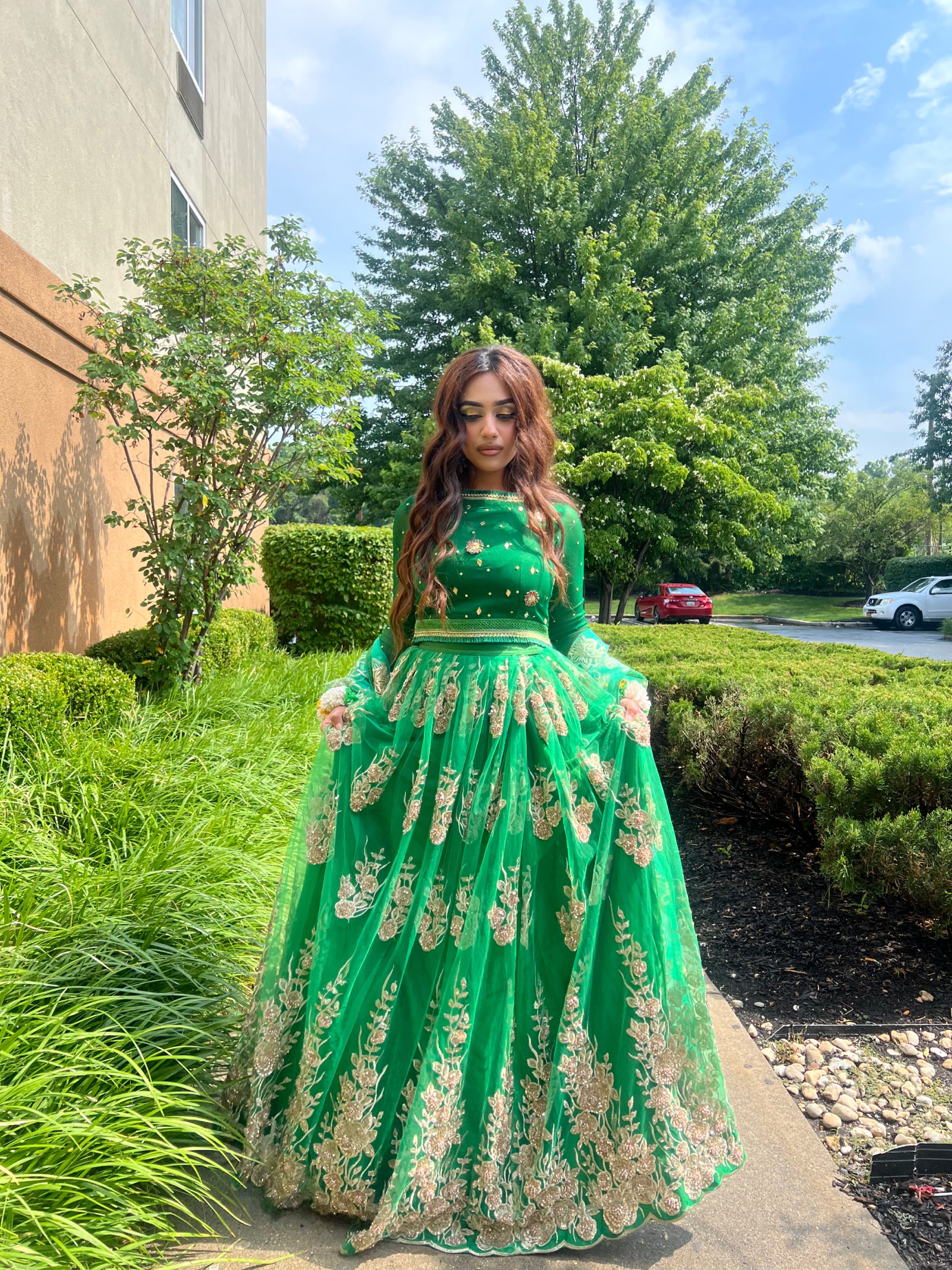 Lehnga: The lehnga is crafted from rich green fabric, offering a vibrant and luxurious backdrop for the intricate gold embroidery. The detailed gold work, with its delicate zari and thread patterns, adds a touch of opulence and radiance to the lehnga. The silhouette flows gracefully, providing a flattering and elegant drape that enhances your natural beauty.
