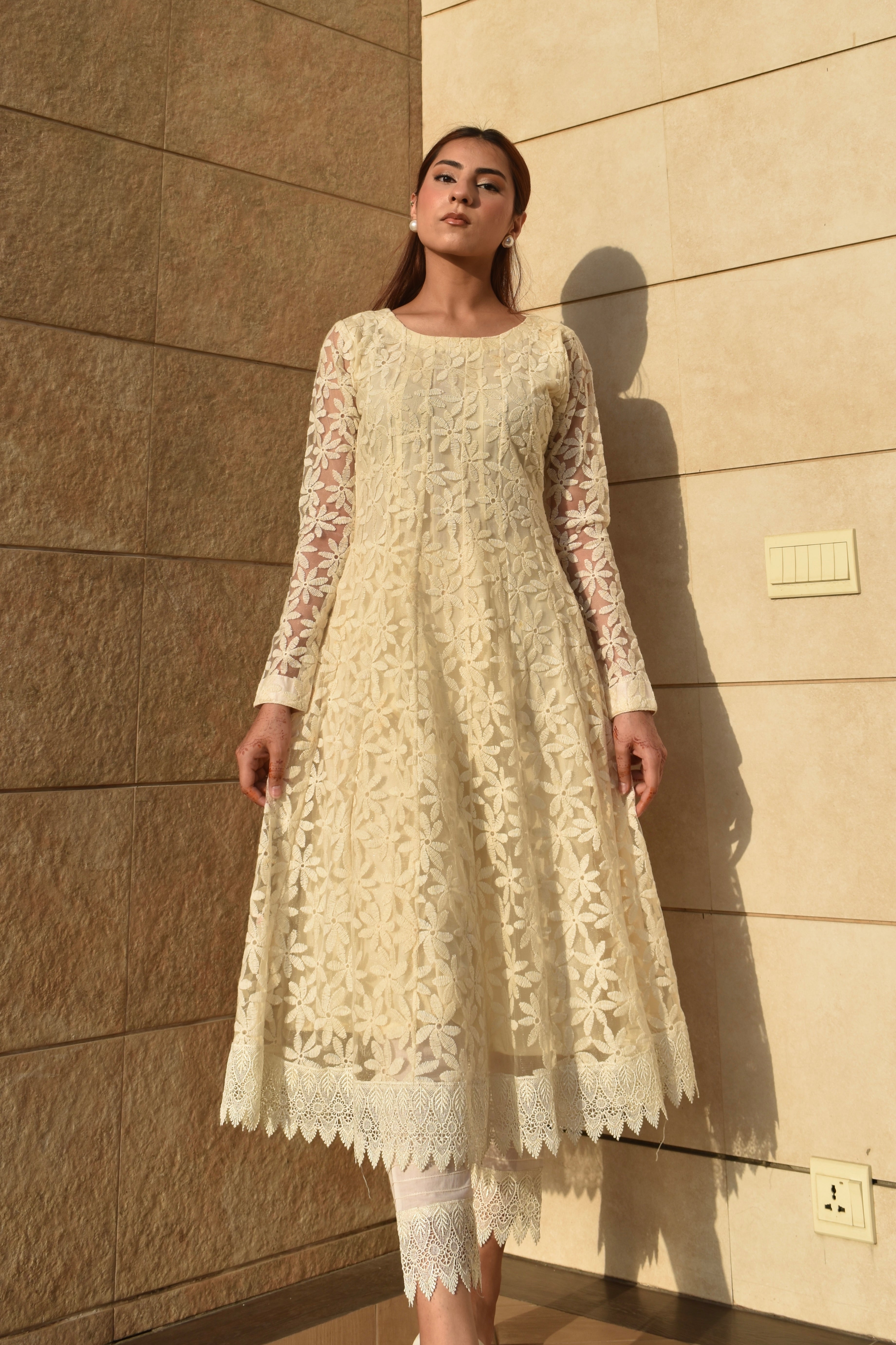 This exquisite white net frock and trouser set combines elegance and modern style, featuring intricate lace detailing on the ends of both the frock and trousers. The delicate net fabric adds a light, ethereal touch, while the lace accents elevate the overall look with a refined finish. Perfect for weddings, festive occasions, or a chic day out, this outfit offers both sophistication and comfort, with coordinating trousers that complete the ensemble beautifully. A timeless piece that promises to make you stand out with its graceful charm. Print May Vary