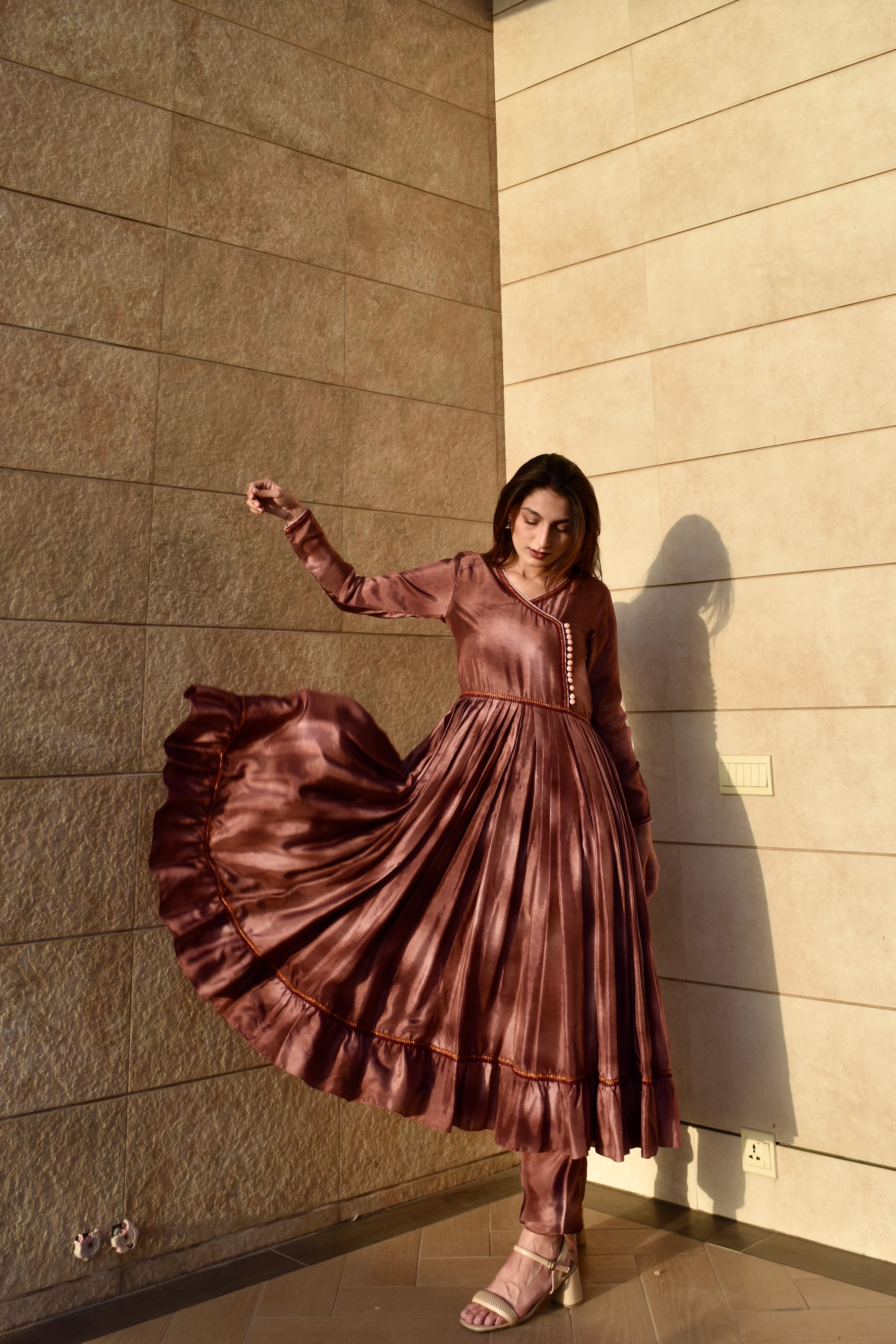 This beautiful two-piece tie-dye Andrakha set with churidar is a perfect blend of contemporary style and traditional elegance. The rich brown tie-dye pattern adds depth and vibrancy to the ensemble, creating a striking look. The Andrakha features a relaxed yet flattering silhouette, while the churidar complements it with a snug, graceful fit that elongates the legs. The delicate lace piping along the edges adds a refined, feminine touch to the outfit. Ideal for both casual and semi-formal events, this chic set is a versatile choice that offers comfort without compromising on style.