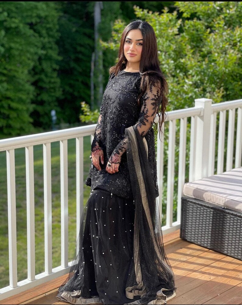 Turn heads with timeless elegance in this luxurious 3-piece stitched black garara suit. Crafted to perfection, this outfit features: