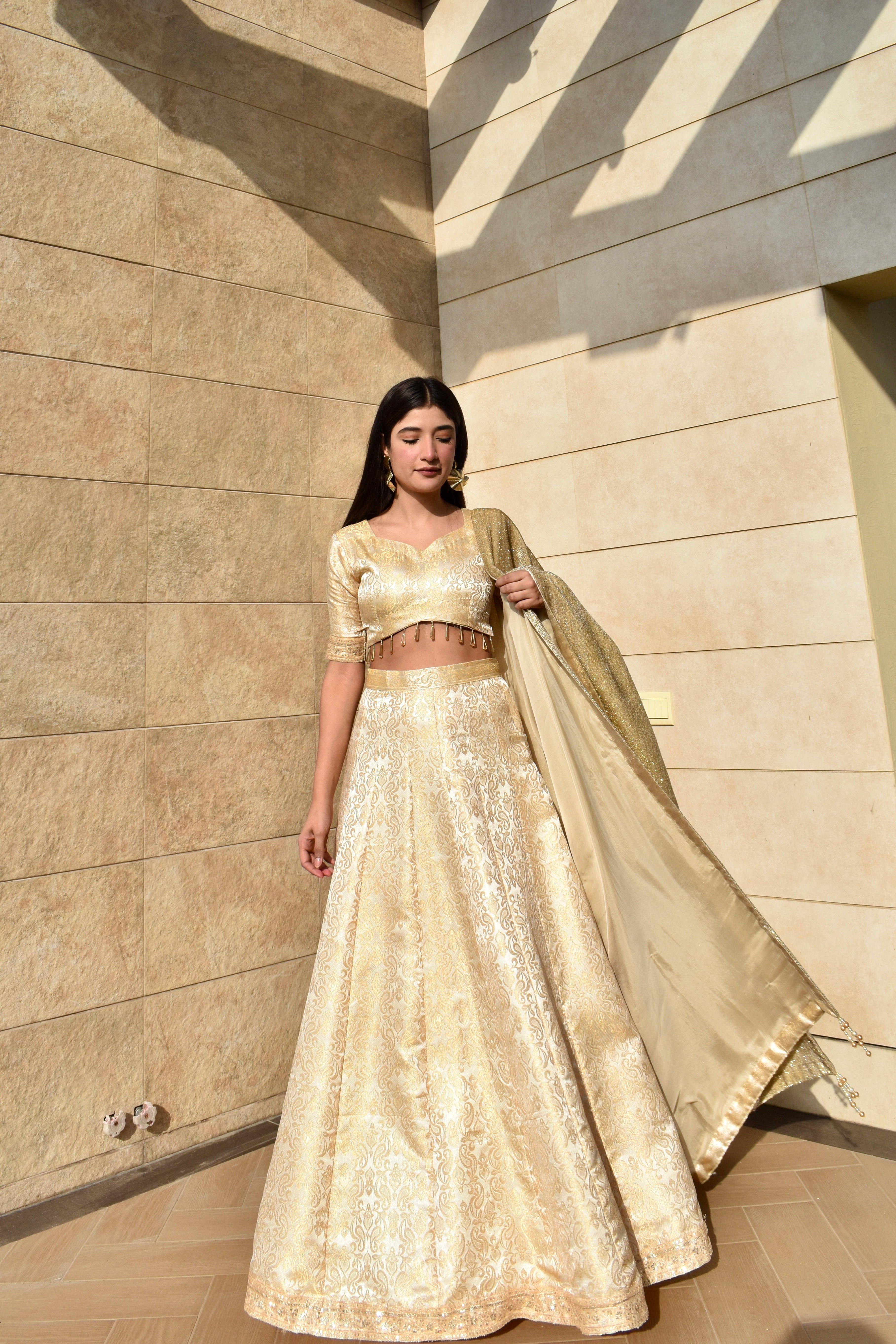 Step into timeless elegance with this exquisite White Gold Lehenga, featuring delicate embroidery and shimmering gold accents. Paired with a luxurious fancy velvet shawl, this ensemble blends tradition and opulence—perfect for weddings, receptions, or festive celebrations.