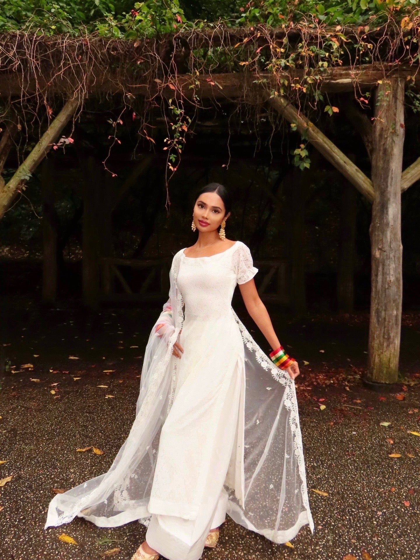 Elegant and timeless this white off-shoulder 3-piece farshi shalwar set features a beautifully draped silhouette with delicate detailing. Paired with a flowy farshi shalwar and a matching dupatta, it exudes effortless grace perfect for festive or formal occasions. Dupatta and print may vary